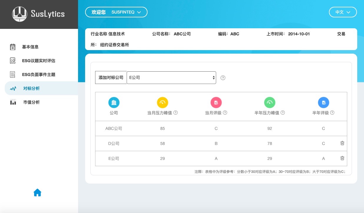 用户可自行选定一组公司进行ESG压力值对比。投资者通常会使用财务或行业等标准选出一组候选公司。当需要对这些候选公司进一步考察时,公司ESG压力值对标分析工具可帮助投资者找出ESG表现更好的公司,并获得更好的回报概率